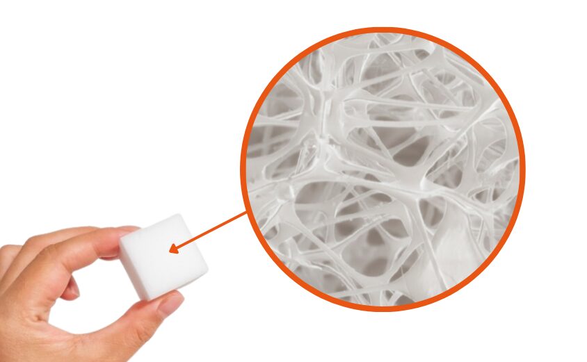 メラミンスポンジは、メラミン樹脂をミクロン単位で発泡させたスポンジです。表面はきめ細かい網目状の構造であり硬度が高いため、水に濡らしてこするだけで水垢やサビなどの汚れを削り取ることができます。