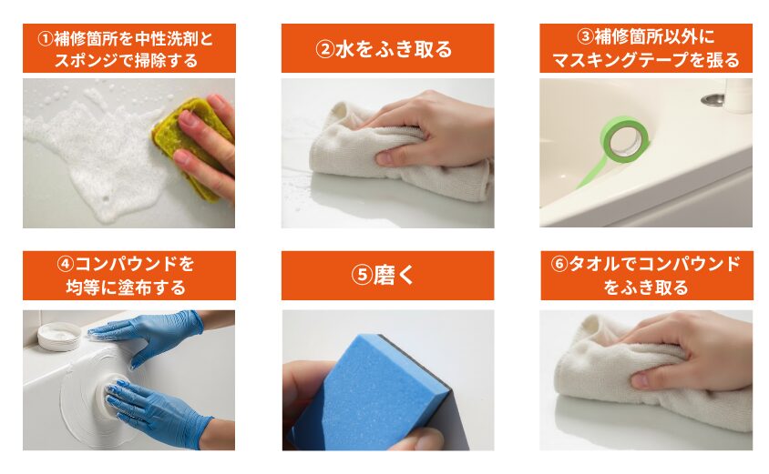 表面にできた浅い擦り傷は液体やペースト状の研磨剤であるコンパウンドを使うことで消すことができます。コンパウンドを傷のある部分に塗り込んで磨くことで、浴槽の表面にある凸凹が削られ、傷が消える仕組みです。ただし、研磨しすぎるとかえって水垢がつきやすくなることもあるため、注意しましょう。
